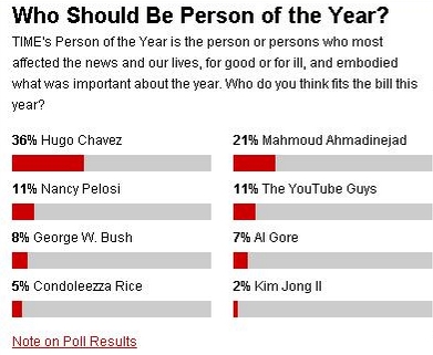 En su versión web, se colgó una encuesta para que cualquier persona (YOU) pueda decidir por el personaje del año, teniendo como candidatos a algunos muy polémicos y cuestionables como George Bush, Kim Jong II, Condoleezza Rice, Hugo Chavez, etc.