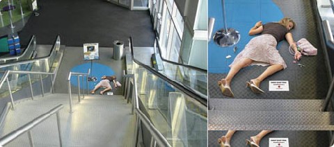 A primera vista parece una mujer desmayada en el piso, pero en realidad es un aviso que muestra esta foto a tamaño real con un aviso al lado que llama la atención sobre la importancia de saber primeros auxilios y la dirección del website de la Cruz Roja de Canadá.