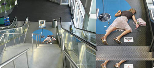 A primera vista parece una mujer desmayada en el piso, pero en realidad es un aviso que muestra esta foto a tamaño real con un aviso al lado que llama la atención sobre la importancia de saber primeros auxilios y la dirección del website de la Cruz Roja de Canadá.